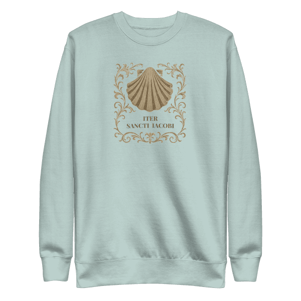 The design is a respectful homage to the 12th-century Codex Calixtinus, the primary source of historical information for the Camino and the very first guidebook ever written for the pilgrimage. The central graphic is a highly detailed, engraved depiction of the iconic Scallop Shell (the concha), surrounded by intricate, decorative scrollwork reminiscent of an illuminated manuscript. Below the shell, the classical text “ITER SANCTI IACOBI” reads, meaning “The Way of Saint James.” Placed on this premium sweatshirt, it’s a sophisticated, wearable artifact that honors the deep historical and medieval roots of the path that millions have traveled.
