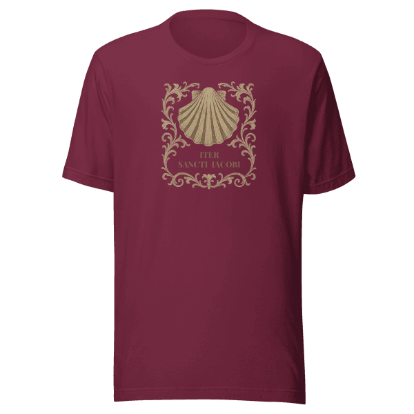 The design is a respectful homage to the 12th-century Codex Calixtinus, the primary source of historical information for the Camino and the very first guidebook ever written for the pilgrimage. The central graphic is a highly detailed, engraved depiction of the iconic Scallop Shell (the concha), surrounded by intricate, decorative scrollwork reminiscent of an illuminated manuscript. Below the shell, the classical text “ITER SANCTI IACOBI” reads, meaning “The Way of Saint James.” Placed on this premium staple tee, it’s a sophisticated, wearable artifact that honors the deep historical and medieval roots of the path that millions have traveled.
