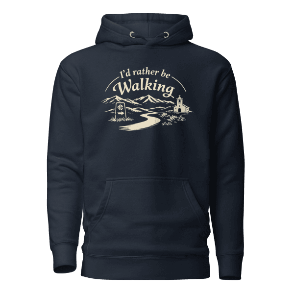 A minimalist illustration inspired by the spirit of El Camino de Santiago, featuring a winding path through mountains leading toward a small chapel beneath the words “I’d Rather Be Walking.” The design captures the essence of pilgrimage, reflection, and the quiet beauty of the journey. Perfect for those who feel called to walk, explore, and embrace the meaning found along the way.