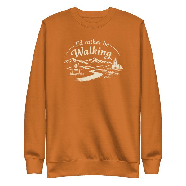 A minimalist illustration inspired by the spirit of El Camino de Santiago, featuring a winding path through mountains leading toward a small chapel beneath the words “I’d Rather Be Walking.” The design captures the essence of pilgrimage, reflection, and the quiet beauty of the journey. Perfect for those who feel called to walk, explore, and embrace the meaning found along the way.
