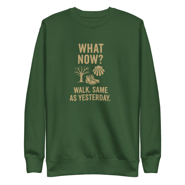 A simple, reflective design inspired by the rhythm of the Camino de Santiago, featuring the phrase “What Now? Walk. Same as Yesterday.” alongside pilgrim symbols like boots, a scallop shell, and a solitary tree. The minimalist layout captures the steady, meditative nature of the journey—one step at a time, day after day. Perfect for those who understand that the path forward is simply to keep walking.