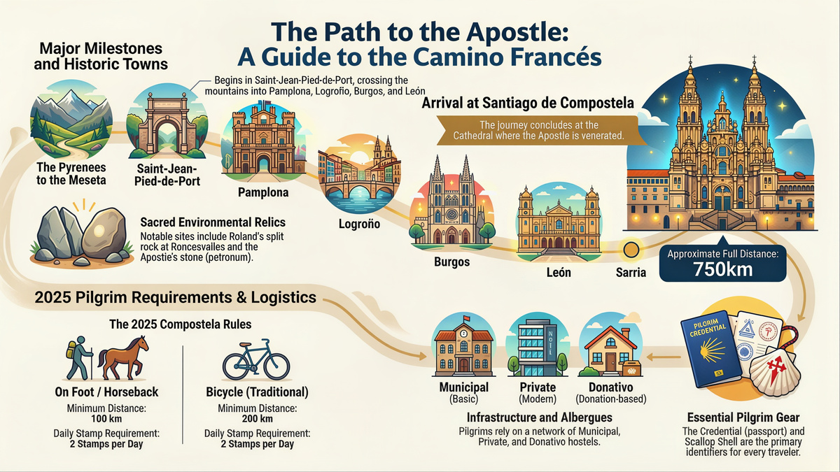 The terrain of the French Way is remarkably diverse. Pilgrims first navigate the dramatic slopes of the Pyrenees before transitioning into the fertile wine regions of La Rioja. The central portion of the journey is defined by the Meseta, a high-altitude plateau between Burgos and León, followed by a mountainous climb through O Cebreiro and into the lush, temperate province of Galicia.